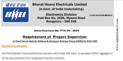Bharat Heavy Electricals Limited has recently published the notification for the vacancies of 01 Project Supervisor Jobs. Desirable candidates can visit the official website and apply online for the BHEL Recruitment for 2024. They are accepting the application form with the qualification of a Diploma. Those candidates should check the official notification and observe the eligibility criteria before applying for the post of Project Supervisor Jobs.